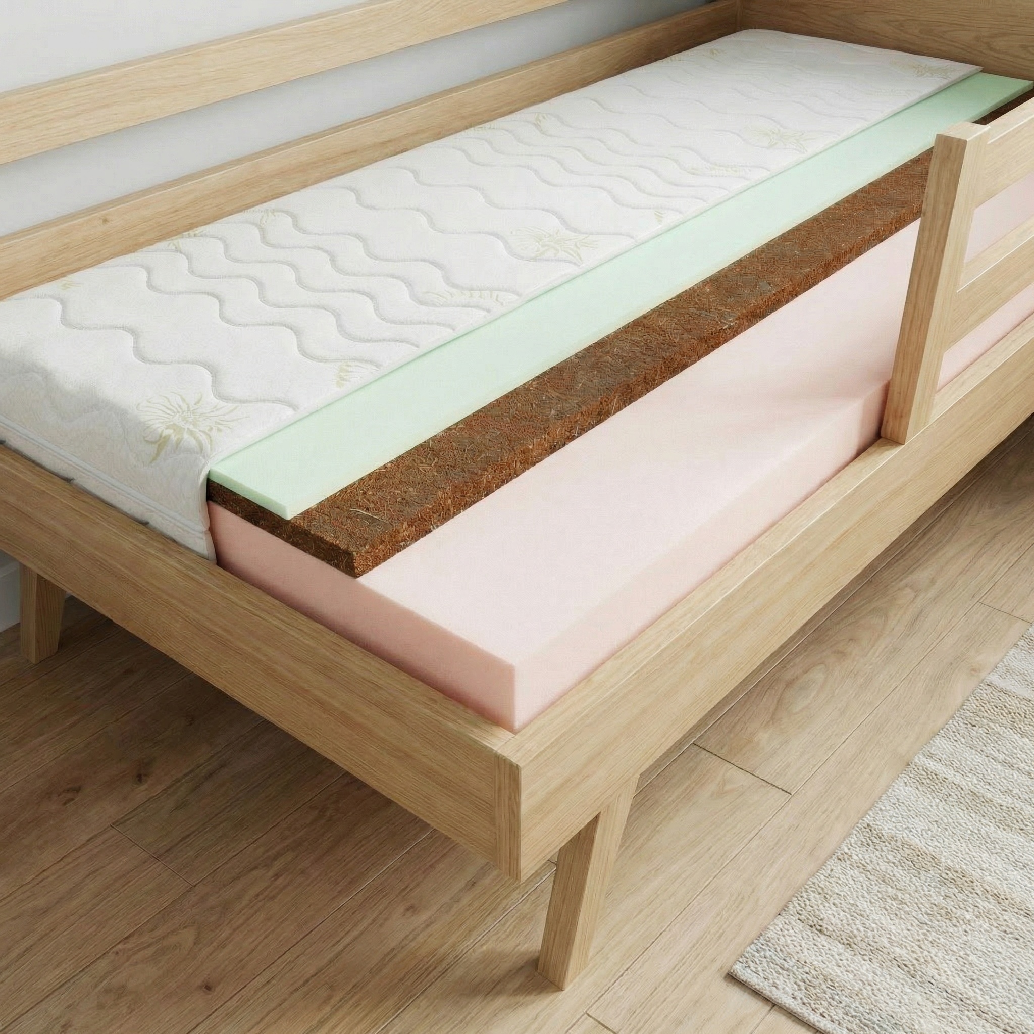Medzi týmito vrstvami sa nachádza kokosové vlákno, ktoré dodáva matracu potrebnú pevnosť a stabilitu. Kokosová vrstva je odolná voči vlhkosti a baktériám, čo zvyšuje hygienu a podporuje zdravý vývoj chrbtice.