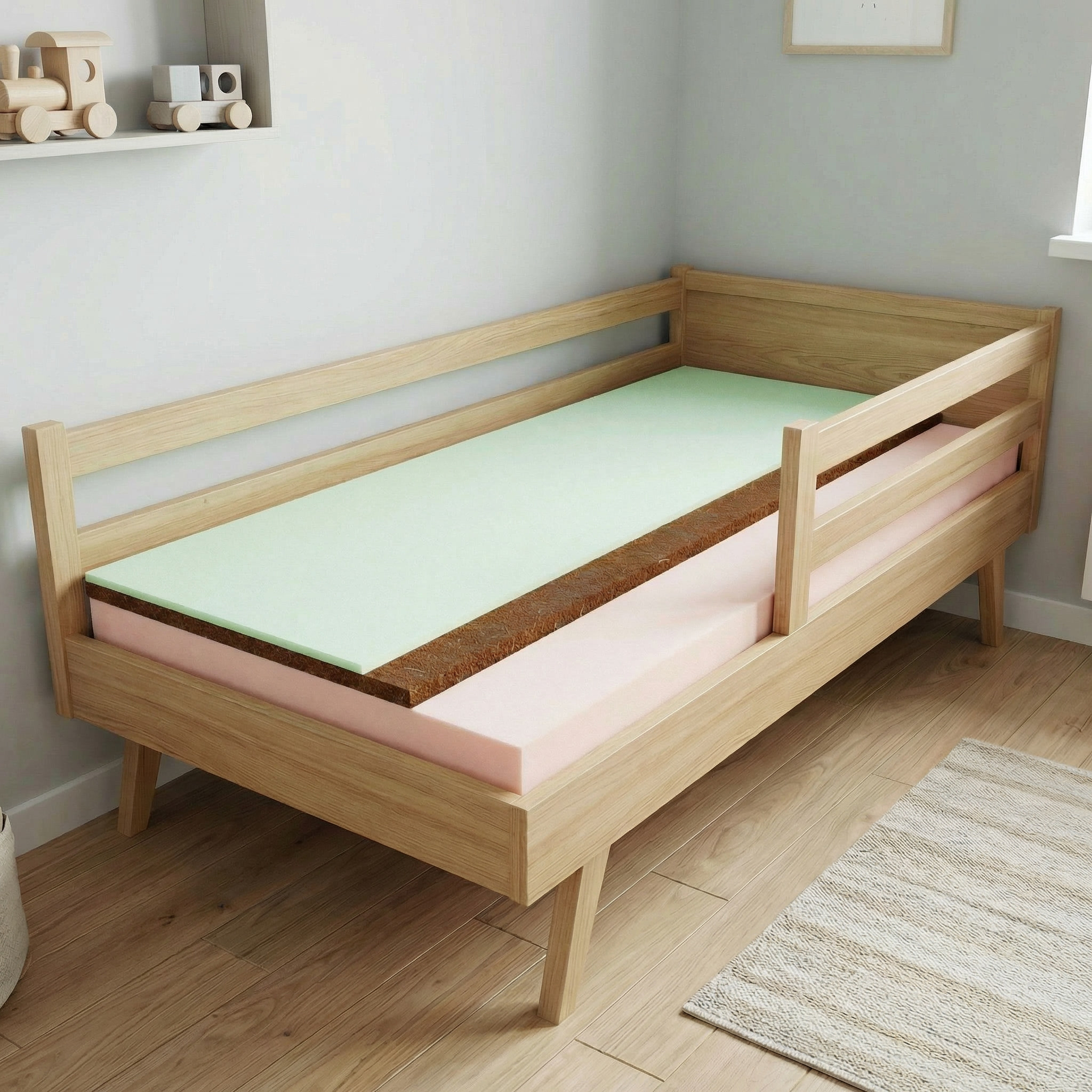Medzi týmito vrstvami sa nachádza kokosové vlákno, ktoré dodáva matracu potrebnú pevnosť a stabilitu. Kokosová vrstva je odolná voči vlhkosti a baktériám, čo zvyšuje hygienu a podporuje zdravý vývoj chrbtice.
